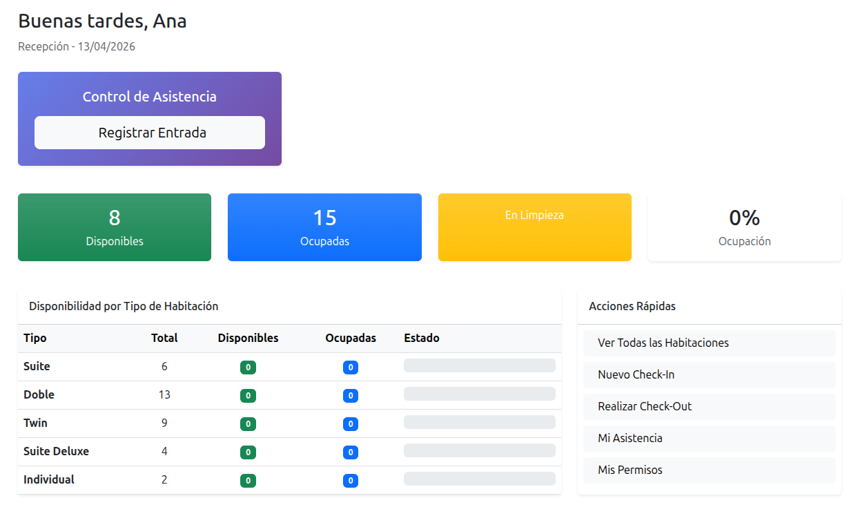 En muchos hoteles pequeños y medianos la coordinación entre departamentos sigue siendo manual: papel, bolígrafo y el recepcionista de turno como único nexo de información entre limpieza, mantenimiento y dirección. Un familiar que trabaja en un hotel me trasladó esta situación, y mi experiencia previa trabajando en un hotel en Edimburgo me permitió entender de primera mano los cuellos de botella operativos: tareas de limpieza que no se asignan a tiempo, incidencias de mantenimiento que se pierden, y fichajes de entrada y salida que nadie registra de forma fiable.
