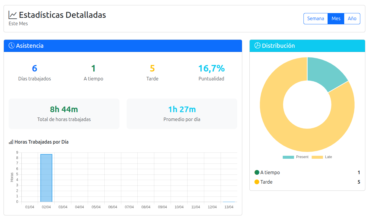 Necesitaba mostrar estadísticas de asistencia de forma visual y nunca había usado ninguna librería de gráficos. El reto principal fue pasar datos desde las vistas de Django a JavaScript: los diccionarios y listas de Python no se pueden inyectar directamente en el template, sino que requieren serialización con json.dumps() para que Chart.js los interprete correctamente.